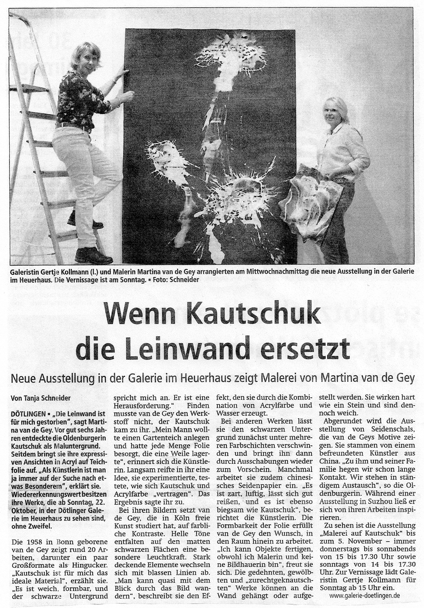 Martina van de Gey, die seit einigen Jahren in Oldenburg lebt und arbeitet, hat sich schon an einigen Ausstellungen in der Region beteiligt und gehört dennoch zu den Entdeckungen, die auf dieses Haus zurückzuführen sind.
