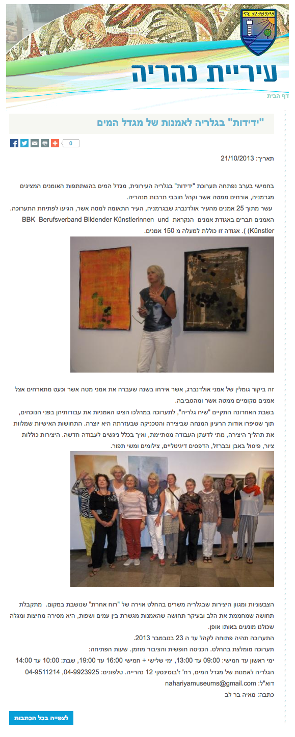 Artikel auf Nahriya Muni zur Ausstellung in Israel, 21.10.2013
